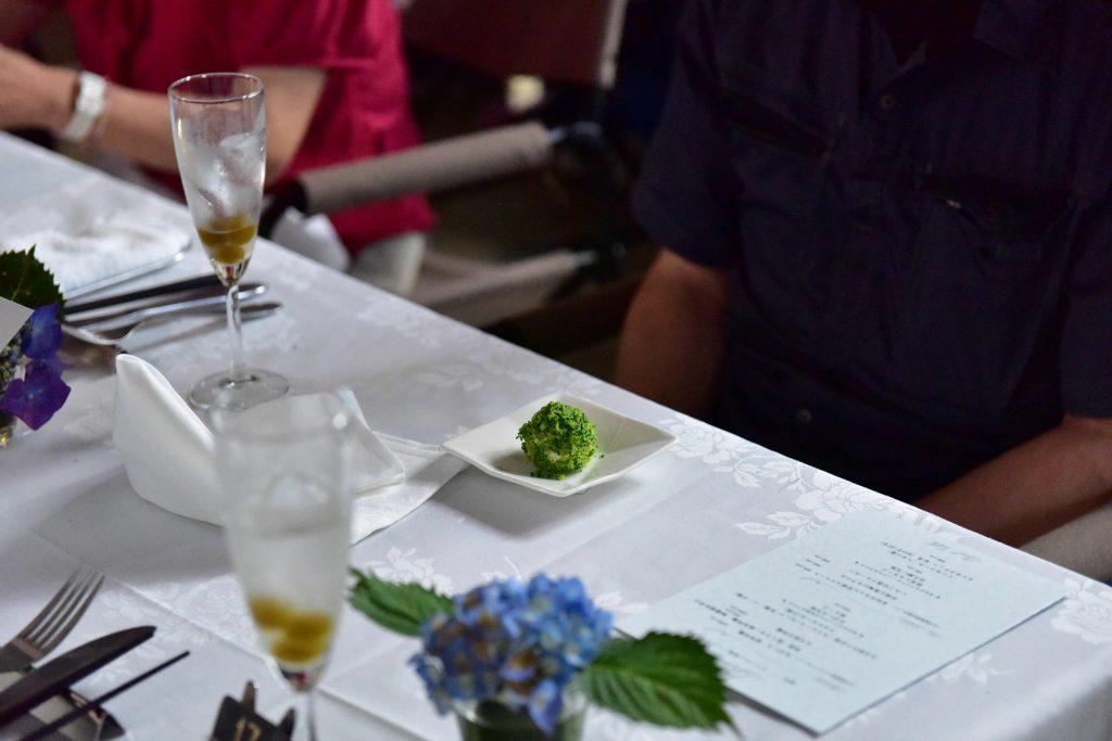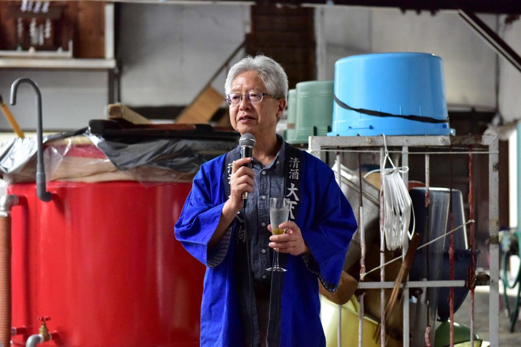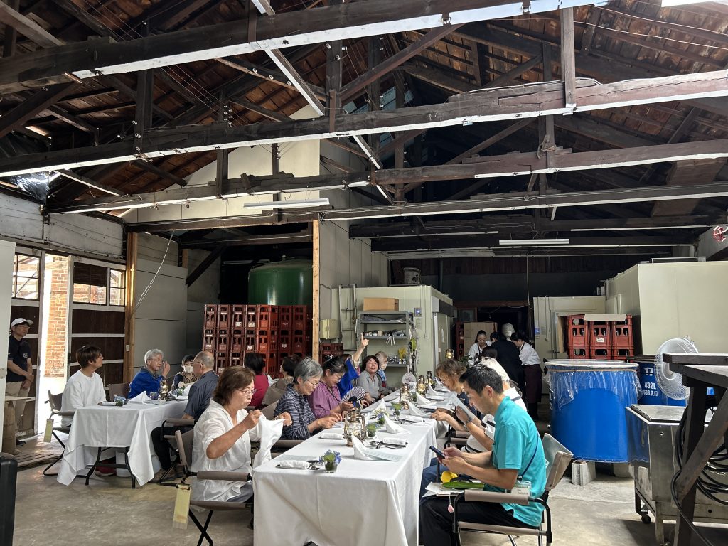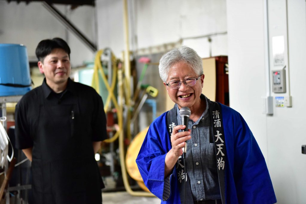 6月にしては予想以上に暑くなったこの日、本来ならば屋外に設営するはずだったダイニングを、急遽大天狗さんのお許しをいただいて、仕込み蔵の中にご用意させていただきました。こんなことが叶うのも、仕込みがお休みの時期ならでは。4代目当主の伊藤さんの乾杯の発声で宴が始まりました。