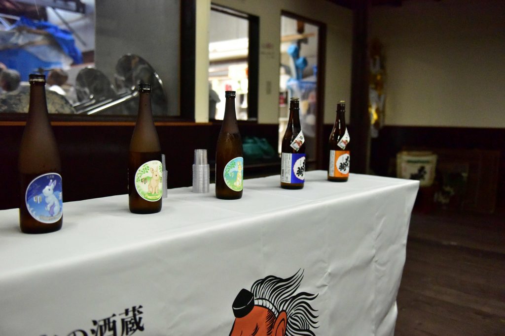 一通り見学が終わると、試飲タイム。5種類の日本酒と2種類の甘酒を試飲させていただきました。さすがにお酒の回だけあって、お酒好きの方が多かったようで、みなさん積極的に味見をされていました。兎のラベルがかわいらしい「卯酒」シリーズは、沙織さんが杜氏になってから作った季節酒のラインナップとのこと。今回は冬から夏にかけての3種類をご用意くださいました。