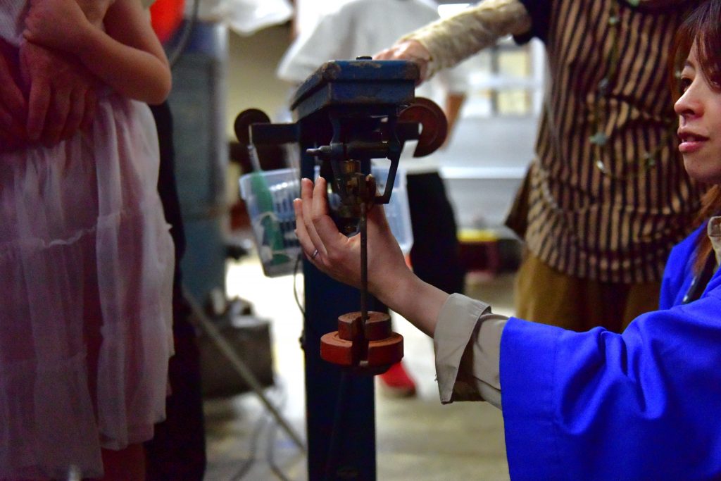 この時期酒造りはお休みですが、酒蔵の中の様々な道具をご紹介いただきました。天井の木製の梁が歴史を感じさせるこじんまりとした空間に、これまた歴史を感じさせる昔ながらの道具がいまだ現役で使われています。