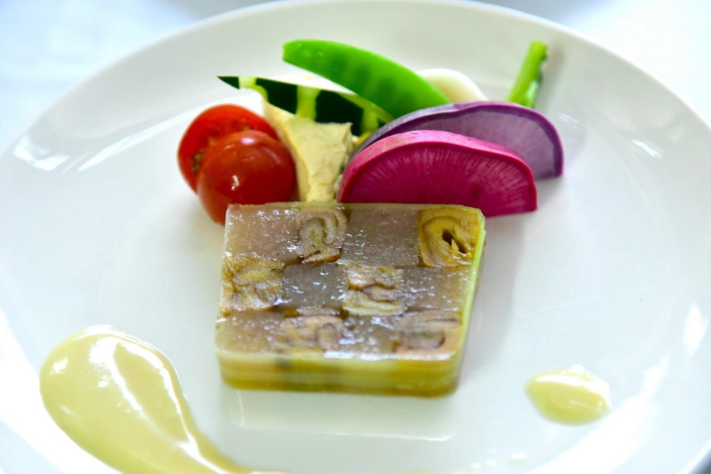 芋がらと生芋こんにゃくのテリーヌ 酒粕のディップ 添えの彩り野菜はすべて大玉産