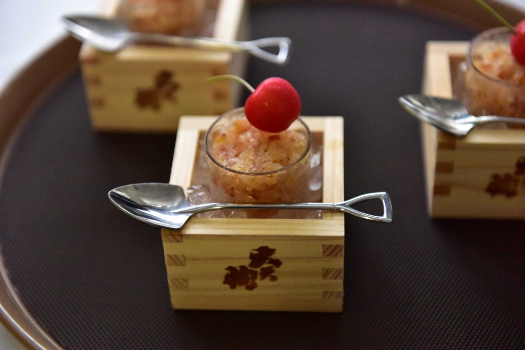 さくらんぼと日本酒のグラニテ 器にした大天狗さんの枡をお土産にするのはシェフのアイディア