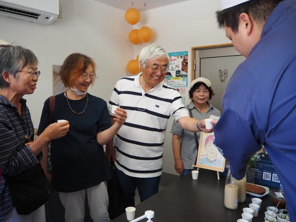 まずは名郷糀屋さんにて、糀造りの工程をご見学&甘酒の試飲体験です。爽やかな甘さと米の旨味を感じられる名郷糀屋さんのオリジナル甘酒のファン多し。体験後は、名郷さんの味噌・甘酒・糀などをお買い求めいただけます。