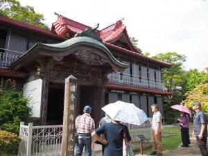 酒蔵を後にしたみなさんを、二つのスポットにご案内しました。まずはその一つ、大天狗酒造さんとも縁のある蛇の鼻遊楽園です。作曲家・古関裕而氏の親友で本宮市出身の歌手・伊藤久男氏は、大天狗酒造さんの縁戚関係にあります。園内に建つ蛇の鼻御殿は、伊藤氏が幼少のころ過ごした邸宅。建物内部や展示も御覧いただきました。