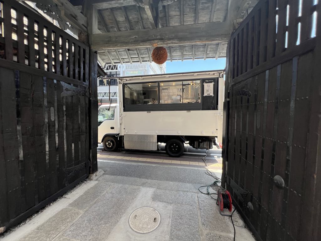 趣のある建物には「大天狗」の文字。本宮駅前とは思えないどこかタイムスリップしたような雰囲気のある酒蔵が今回の舞台です。なんと、駅よりも先に酒蔵があったそうな。今回我らがフードカートは、残念ながら重厚な門をくぐることができず、入り口で皆様をお出迎えしました。