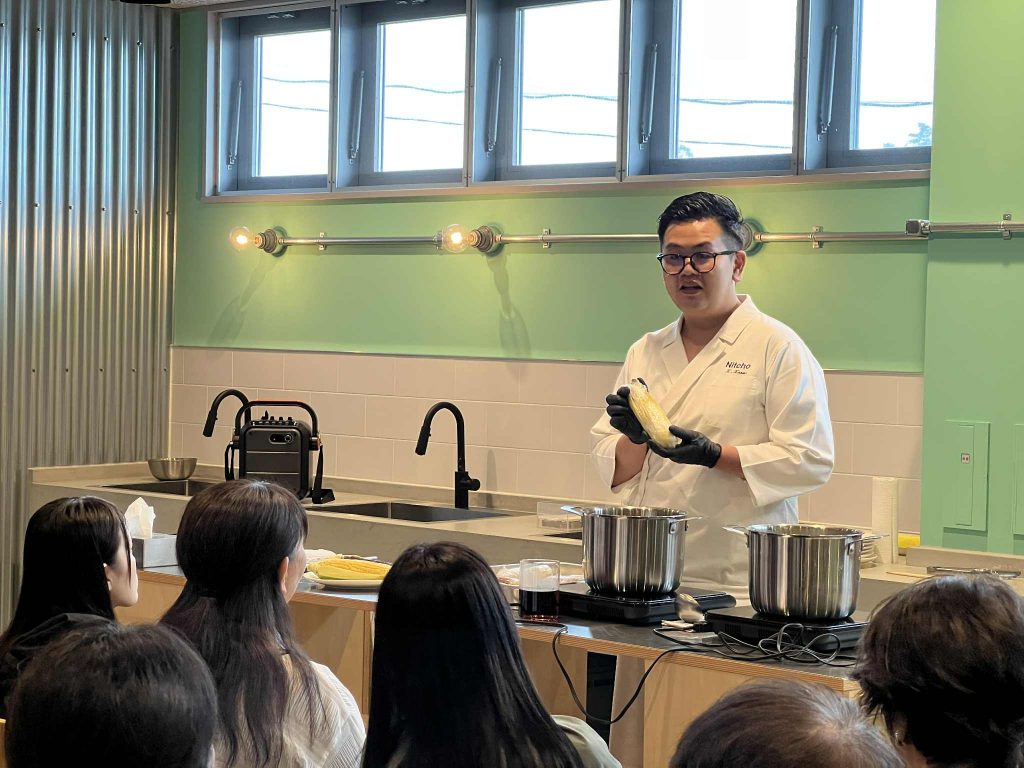 場所を変えて、日本調理技術専門学校が運営するTHE KITCHENを見学します。また鈴木農場さんのとうもろこしを10倍美味しくいただく方法を日本調理技術専門学校の講師の方よりレクチャーいただきます。