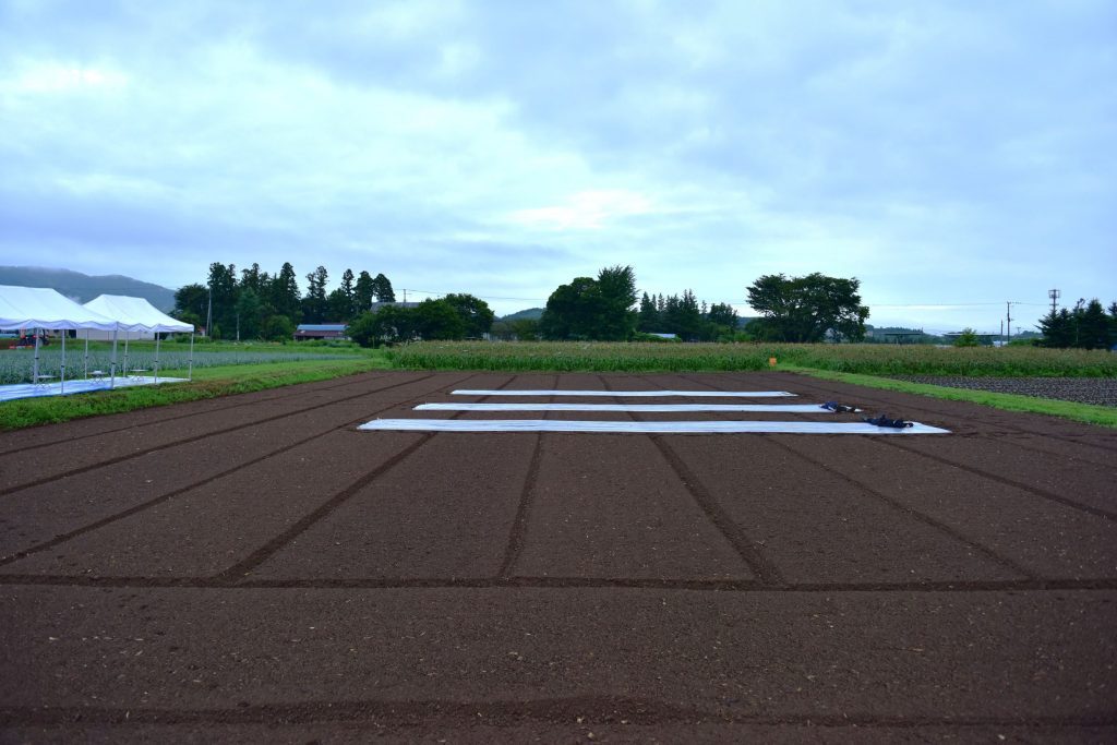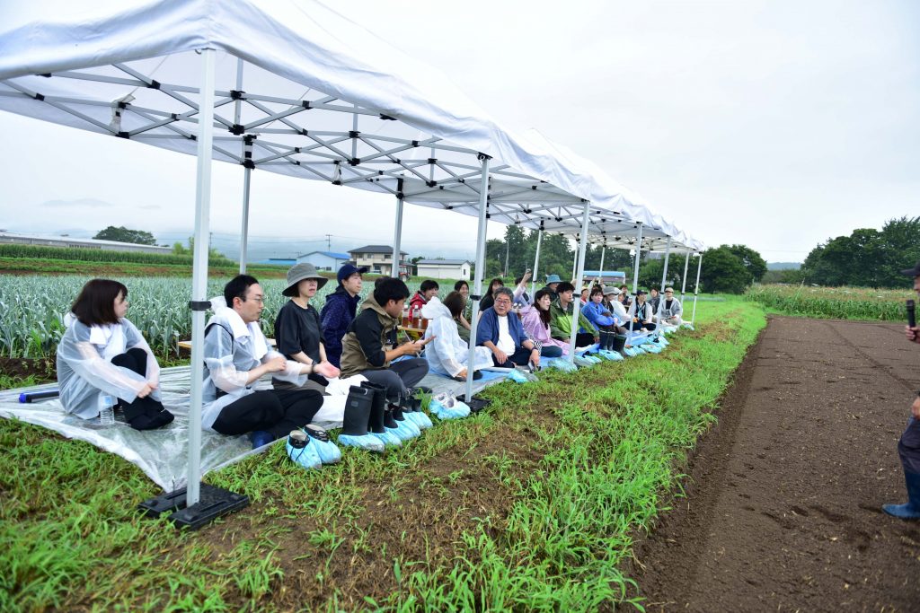 開催当日は雨予報、参加者のみなさんには残念ながら鈴木農場の人気コンテンツ「野菜の気持ち」体験はできないかもしれないとお伝えしていました。ところが、早朝畑に到着すると、「野菜の気持ち、できそうだからやろう!」と鈴木さん。整然と耕されたふかふかの畑に、農業用シートを敷いていただき、体験会場の完成です。バスが畑に到着するころになると、まるでみなさんをお出迎えするように雨がやみました。