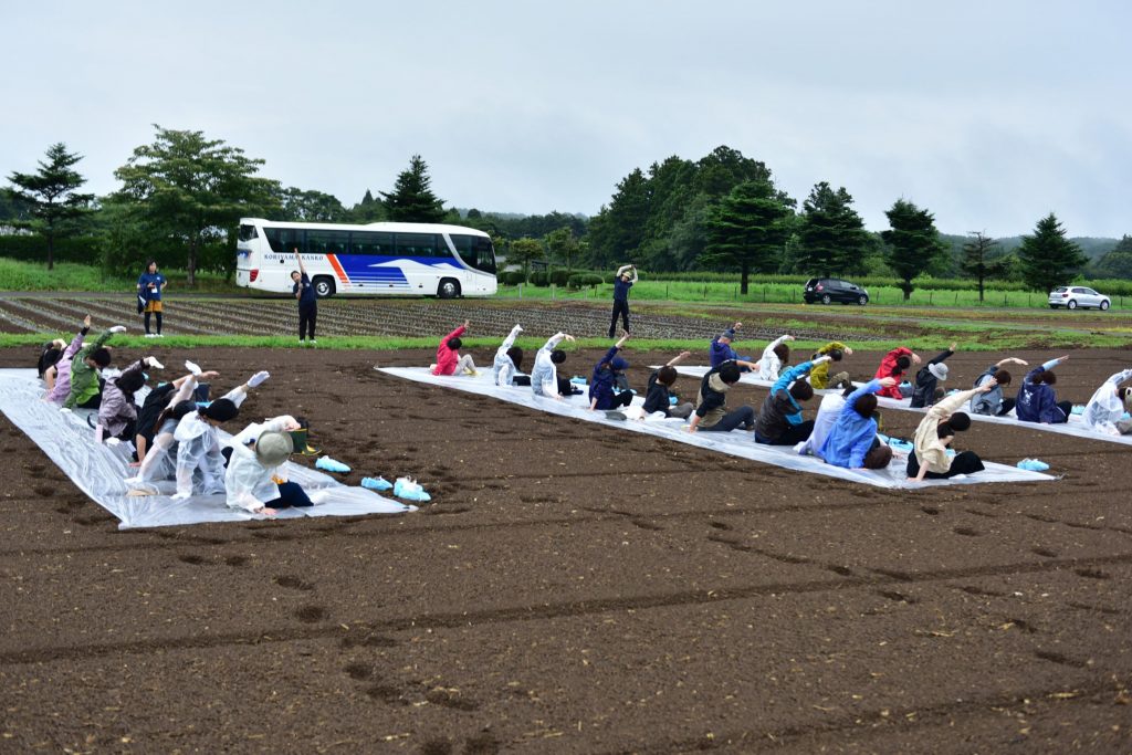 野菜の気持ちになる体験。畑に一歩踏み入れた時のふかふかの土の感触は感動もの。今回は、土の上で清々しい空気のなかゆっくりストレッチをしていただきました。