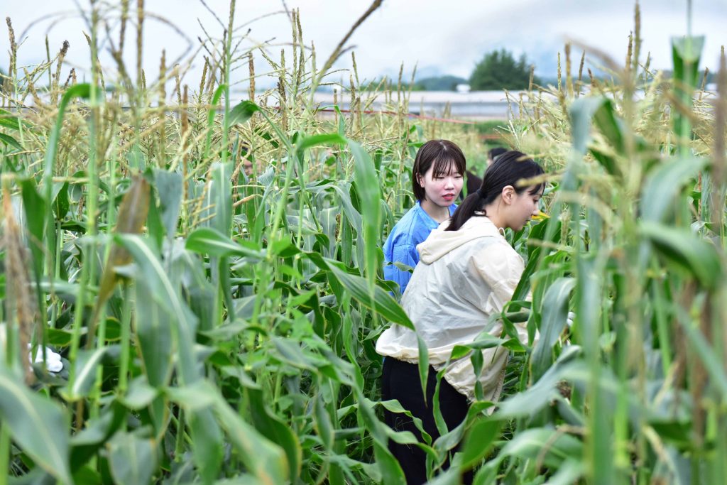 その後は、とうもろこし畑に分け入り、郡山ブランド野菜の「とうみぎ丸」の収穫&生かじり体験です。