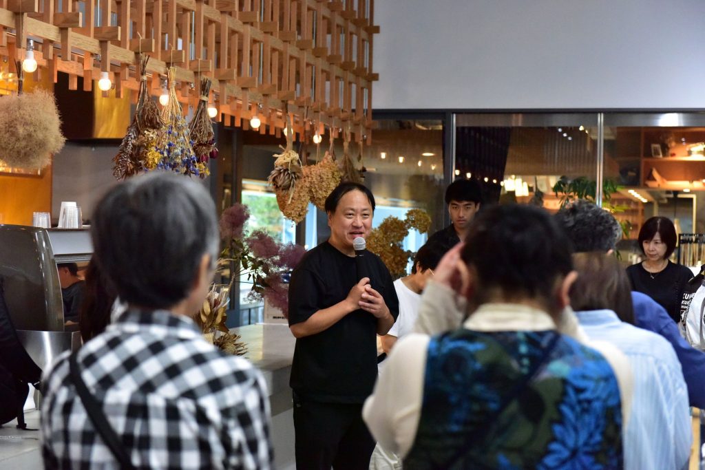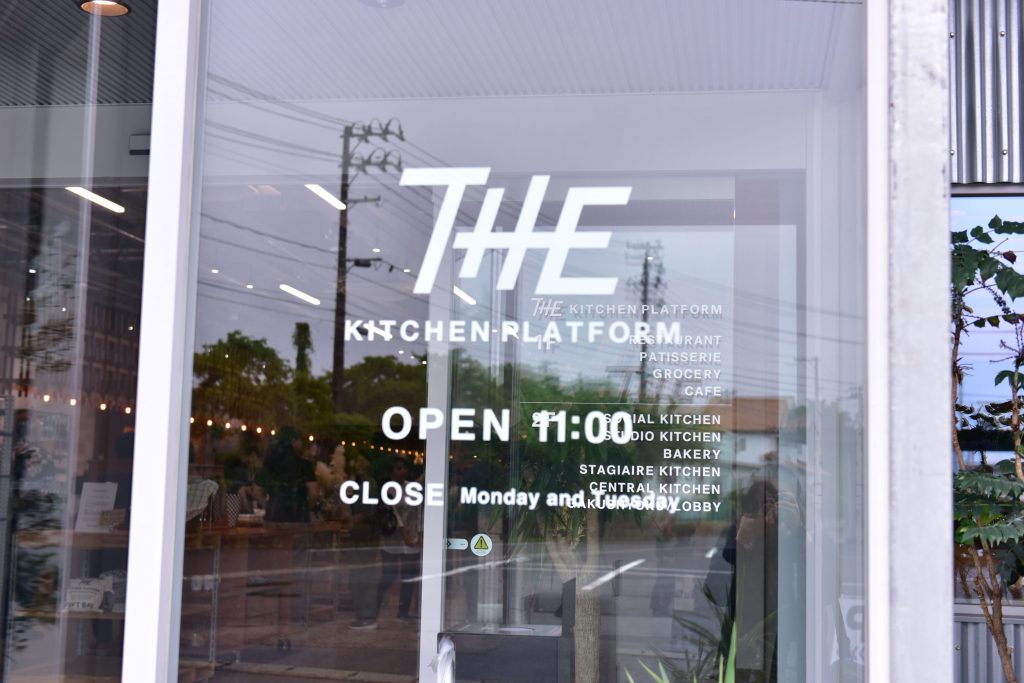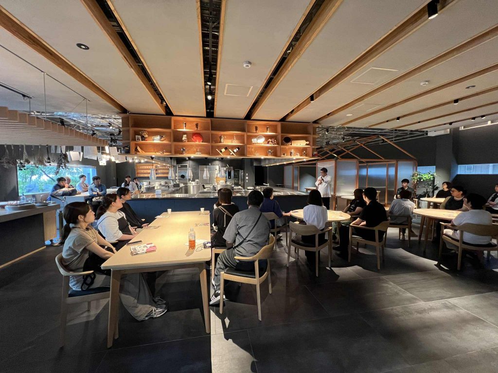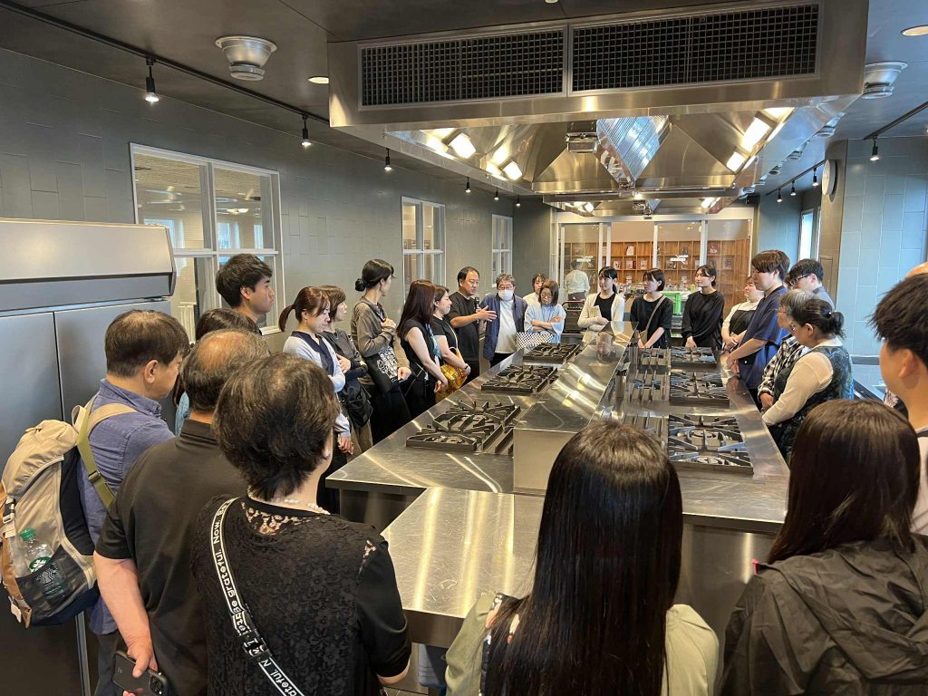 雨が激しくなってきた畑を早々に出発し、本日の食事会場となる「THE」に到着。こちらの施設は、郡山市安積町にある日本調理技術専門学校(以下Nitcho)さんが運営するキッチンプラットフォームで、パティスリーやグロッサリー、カフェなどの店舗や、本格フレンチレストラン、様々な用途のキッチンスペース、学食等が完備された先進的な食の発信基地です。まずは、その施設見学ツアーがはじまります。