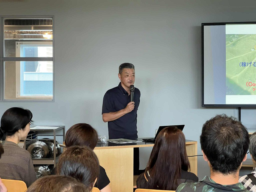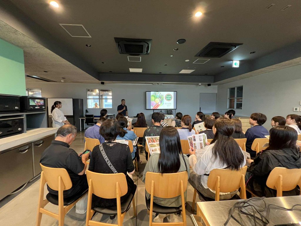 続いて、料理教室用のスペースに移動して、鈴木さんの講演会がはじまりました。普段畑だけではなかなか伝えきれないお話を、スライドを使ってお話しいただきました。まるで鈴木先生の授業さながらに、みなさんお話に聞き入っていました。