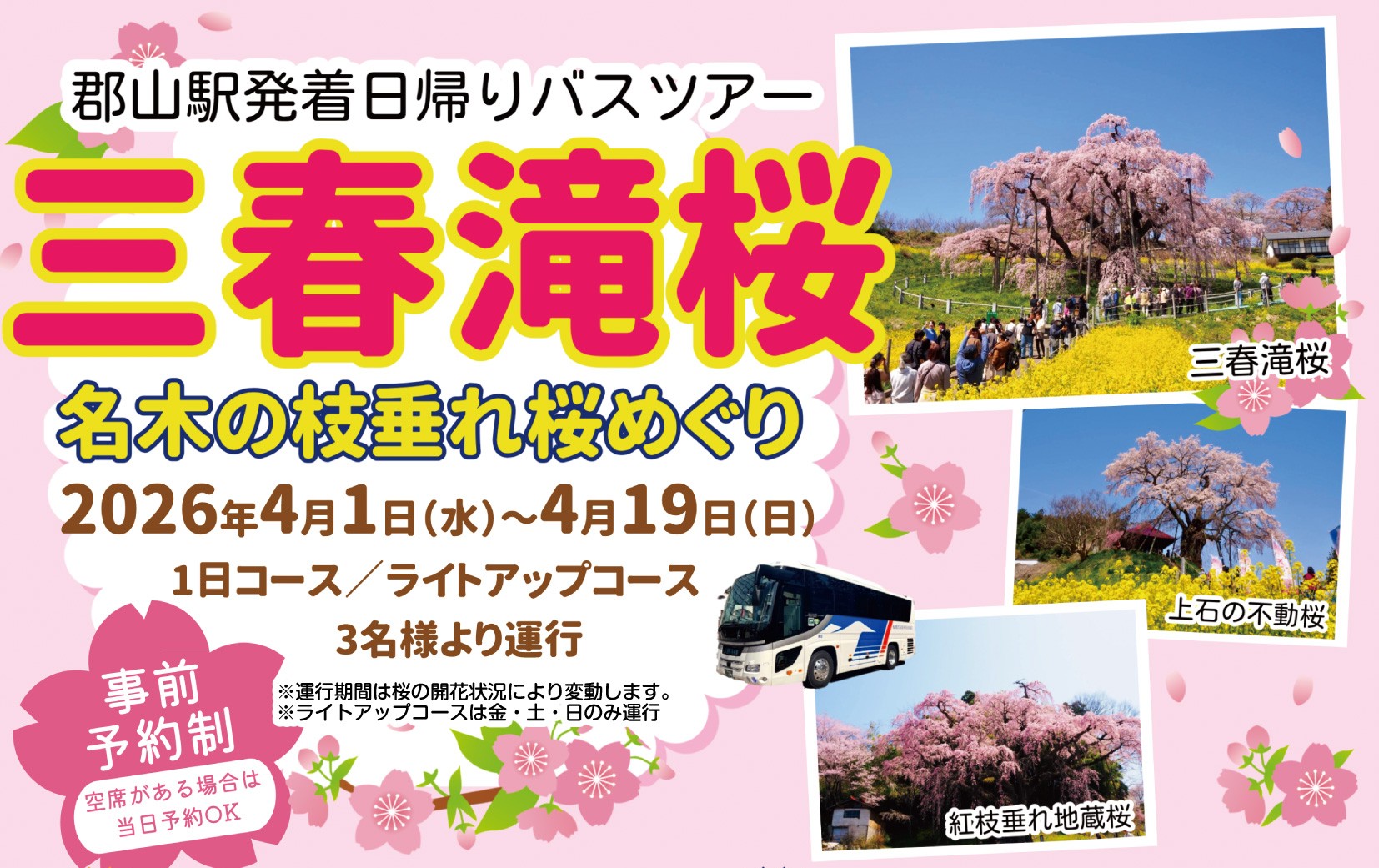 一度にたくさんの枝垂れ桜が見学できるバスツアーを令和8年4月1日(水)~令和8年4月19日(日)まで運行いたします。
