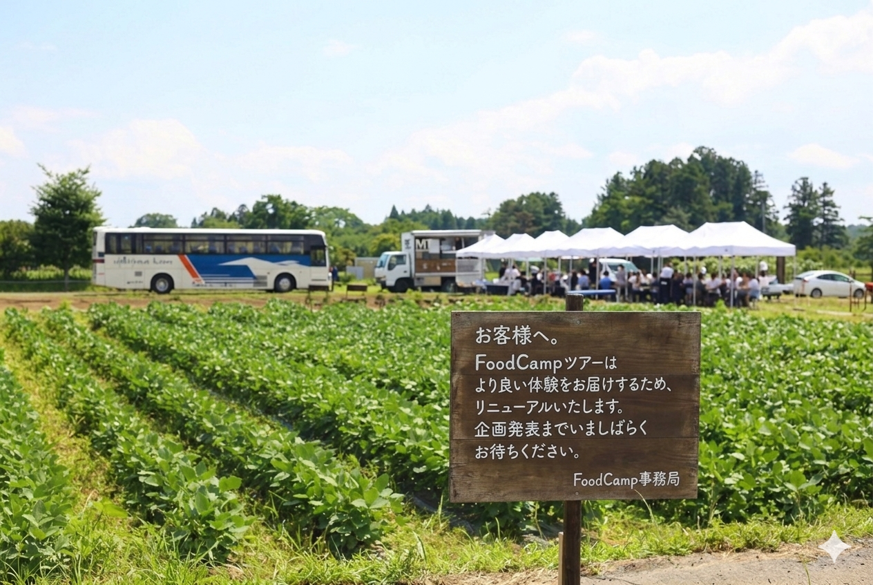 この度、FoodCampは、より魅力的なツアーをご提供できるよう、ツアー内容の再編を行うこととなりました。 そのため、企画発表が遅れておりますこと、心よりお詫び申し上げます。